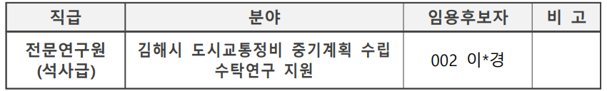 2025년도 제4회 김해연구원 정원 외 직원 채용 최종합격자 선정결과를 다음과 같이 공고합니다.