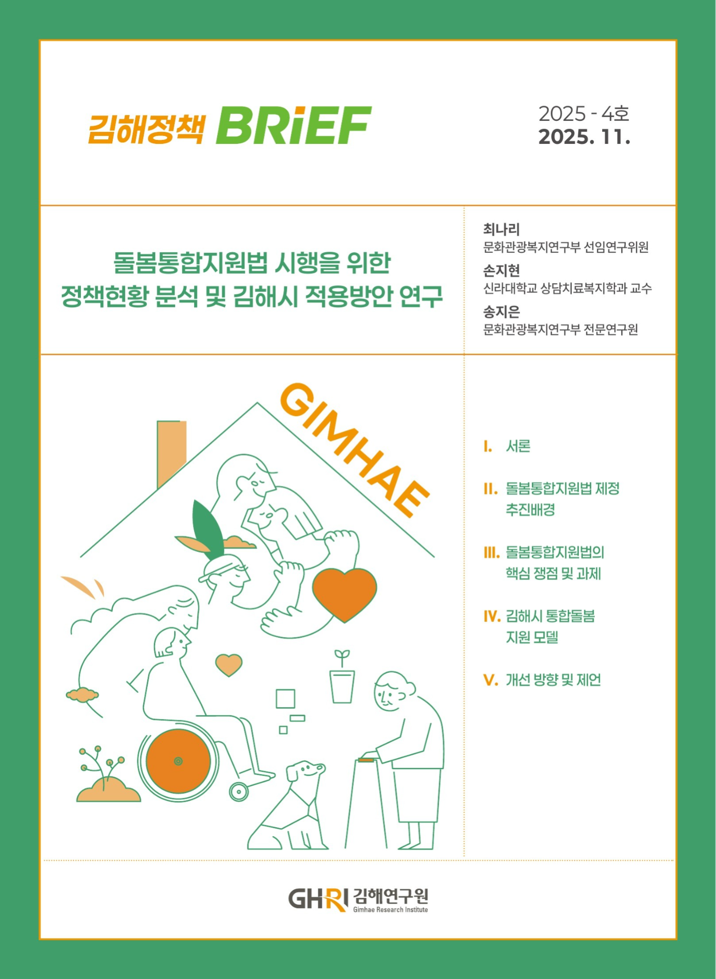 돌봄통합지원법 시행을 위한 정책현황 분석 및 김해시 적용방안 연구에 관한 김해정책브리프입니다.