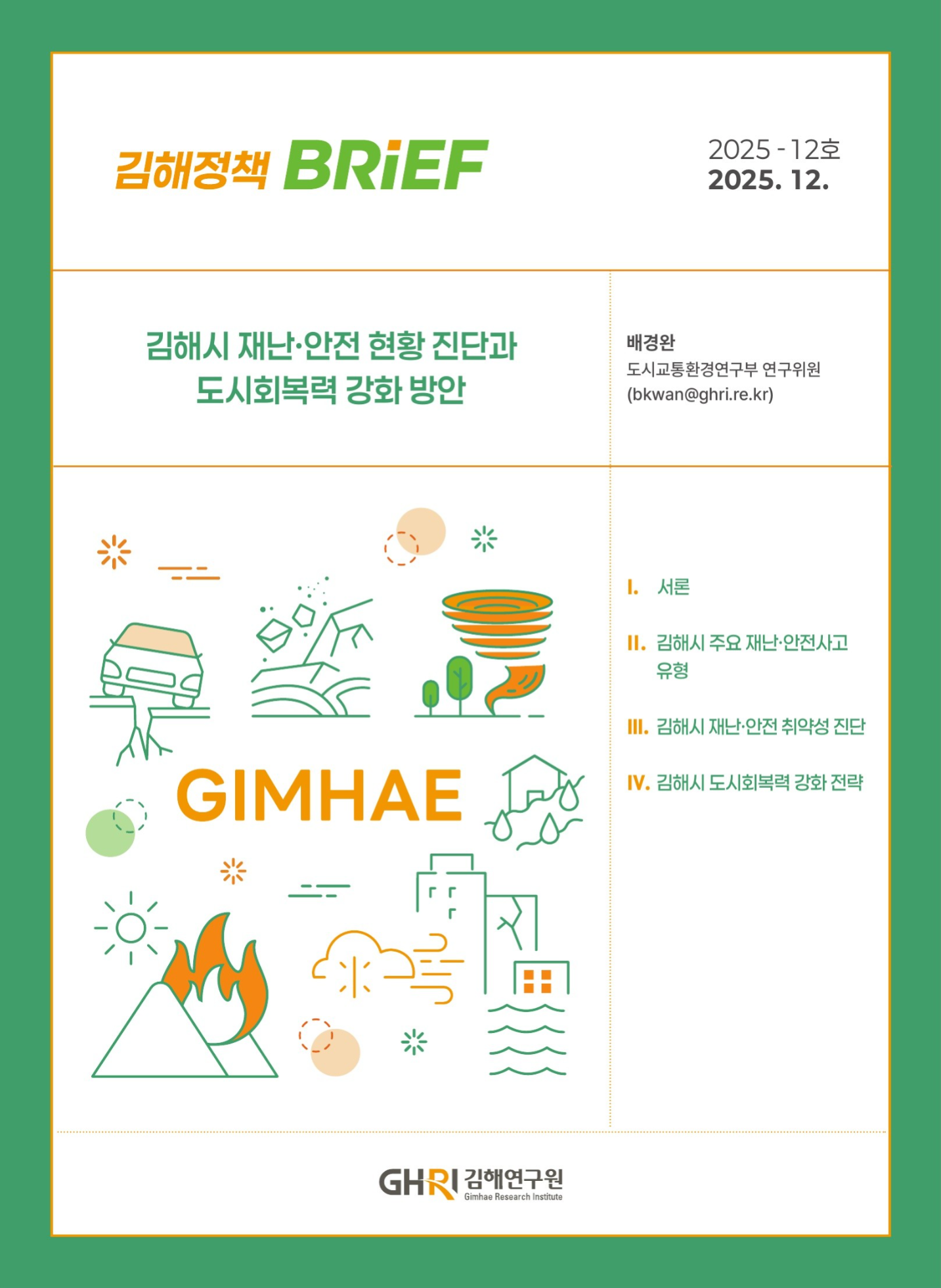 김해시 재난·안전 현황 진단과 도시회복력 강화 방안에 관한 김해정책브리프입니다.